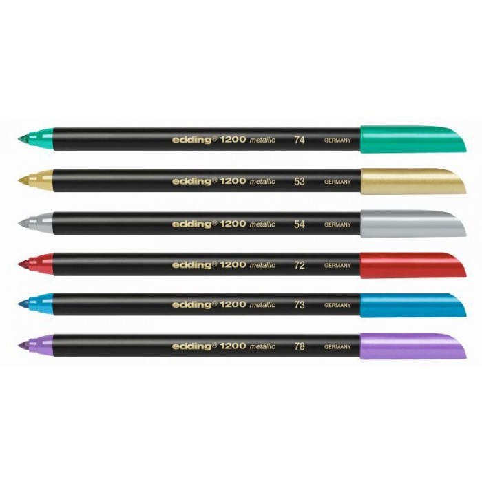 Malen und Schreiben mit Metalleffekt, das können Sie mit dem EDDING 1200 metallic colourpen. Dieser Marker ist ideal, um auf dunklem Papier oder Pappe zu gestalten, sogar auf glatt beschichteten Papiersorten. Ob es persönliche Glückwünsche auf einer dunklen Karte sein sollen, die Beschriftung eines Foto-Albums oder ein mit Liebe gestalteter Kalender – fast jede Idee können Sie mit diesem Produkt unkompliziert umsetzen. Auch zum Schreiben oder Markieren eignet sich der EDDING metallic colourpen. Falls Sie Namensschilder oder andere Schriftzüge entwerfen wollen, die gut lesbar sind und dabei edel wirken sollen, greifen Sie zum edding metallic colourpen. Diese Farben werden in einer wassergelösten Tinte, durch ein Filtersystem in die Stiftspitze geleitet, wo sie dann beim Auftragen deckend und kräftig wirken. Die Farbe zeichnet sich nach dem Auftrocknen durch hohe Lichtbeständigkeit aus.
