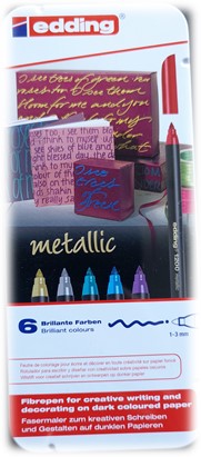 Malen und Schreiben mit Metalleffekt, das können Sie mit dem EDDING 1200 metallic colourpen. Dieser Marker ist ideal, um auf dunklem Papier oder Pappe zu gestalten, sogar auf glatt beschichteten Papiersorten. Ob es persönliche Glückwünsche auf einer dunklen Karte sein sollen, die Beschriftung eines Foto-Albums oder ein mit Liebe gestalteter Kalender – fast jede Idee können Sie mit diesem Produkt unkompliziert umsetzen. Auch zum Schreiben oder Markieren eignet sich der EDDING metallic colourpen. Falls Sie Namensschilder oder andere Schriftzüge entwerfen wollen, die gut lesbar sind und dabei edel wirken sollen, greifen Sie zum edding metallic colourpen. Diese Farben werden in einer wassergelösten Tinte, durch ein Filtersystem in die Stiftspitze geleitet, wo sie dann beim Auftragen deckend und kräftig wirken. Die Farbe zeichnet sich nach dem Auftrocknen durch hohe Lichtbeständigkeit aus.